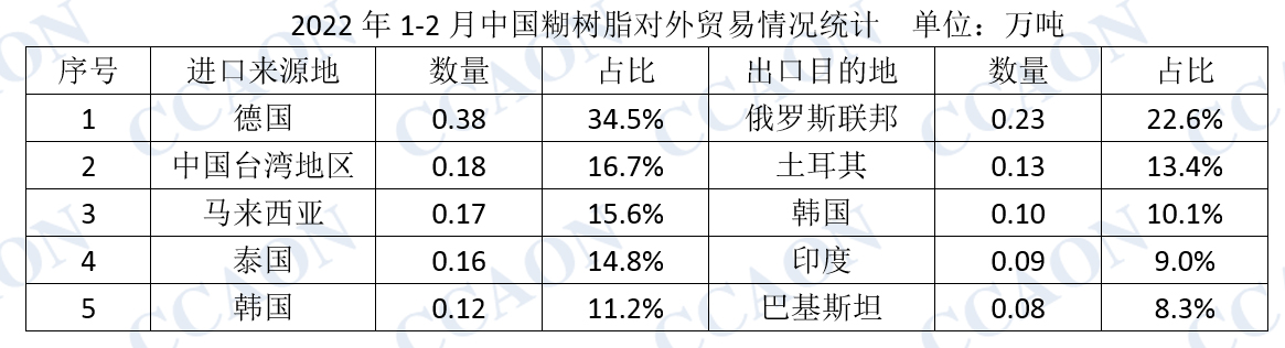 从进口来源地分析,1-2月份,国内糊树脂主要来自德国、中国台湾地区、马来西亚以及泰国;1-2月份,国内糊树脂出口目的国主要包括俄罗斯联邦、土耳其、韩国、印度和巴基斯坦。
