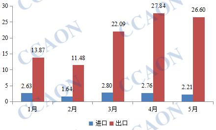2022年1-5月中国PVC纯粉进出口统计 (单位:万吨)