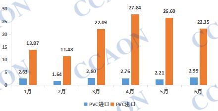 上半年,由于房地产及相关行业表现不佳,PVC国内需求持续疲软,市场成交重心震荡下跌,生产企业和贸易商积极寻求出口以缓解内需压力。国际市场PVC货源缺口一直存在,我国PVC出口量维持在较高水平,在一定程度上缓解了国内市场供应相对充裕的情况。