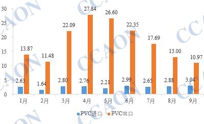 2022年1-9月,我国累计进口PVC纯粉23.6万吨,同比下降22.1%;1-9月份出口PVC纯粉165.9万吨,同比上涨24.2%。