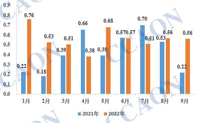 据最新海关统计数据显示,2022年9月份,我国氯乙酸出口量为0.56万吨,环比上月基本持平,同比去年9月份大幅增长159.4%;2022年1-9月份我国氯乙酸累计出口5.06万吨,与去年同期的3.86万吨相比,增长31.02%。前三季度,国内氯乙酸市场处于较为明显供应过量,下游中间体、农药等行业需求不足,成交重心随着主要原料价格而波动,生产企业盈利空间十分有限,出口成为调节国内市场供需关系的重要手段。企业积极性提升以及国际市场需求稳定增长,共同推动氯乙酸出口明显增加。以主要出口企业后续的接单情况预计,四季度国内氯乙酸出口仍将保持较为平稳的态势。