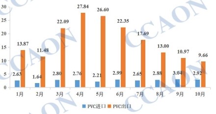 根据最新的海关统计数据,2022年10月当月,我国PVC纯粉进口量2.92万吨,环比上月减少4.1%,同比去年降低4.9%;当月出口量9.66万吨,环比上月减少11.9%,同比去年降低13.5%。据了解,美国PVC外销量持续增长,对东南亚、南亚等主要消费地的供应已恢复至正常水平,国际PVC价格不断松动,国内产品外贸窗口收窄。与此同时,进口低价货源对国内市场的冲击逐渐显现。