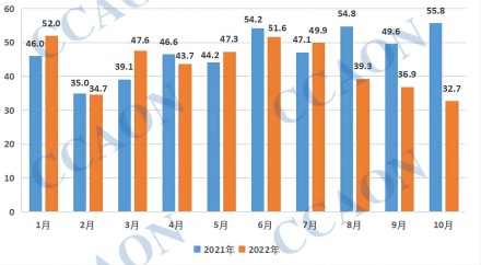 根据最新的海关统计数据,2022年10月份我国PVC地板出口量为32.71万吨,环比上月出口量36.90万吨下降11.34%,同比去年出口量下降41.33%。2022年1-10月份我国PVC地板累计出口435.70万吨,与去年同期472.37万吨相比,减少7.76%。自6月以来,国内PVC地板出口连续4个月出现下调,且环比跌幅较为明显,分析认为,一方面原因是终端客户前期备货充足,新的需求预期有限,另一方面是国际经济下行压力增大,普遍的通胀导致消费能力下降,从而对国内PVC地板的出口造成一定的限制。