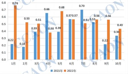 据最新海关统计数据显示,2022年10月当月,我国氯乙酸出口量为0.43万吨,环比上月下降22.82%,同比去年10月份增长28.39%;2022年1-10月份我国氯乙酸累计出口5.49万吨,与去年同期的4.20万吨相比,增长30.88%。据了解,当月国内氯乙酸厂家开工负荷维持在较低水平,下游农药、中间体等行业运行情况欠佳,厂商积极寻求出口以缓解市场供需失衡,就后续接单情况了解,预计11月出口量平稳为主。