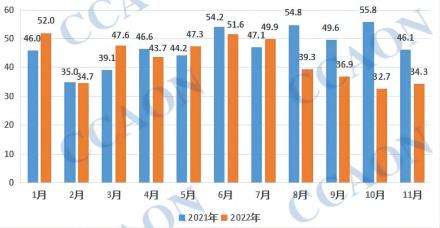 根据最新的海关统计数据,2022年11月份我国PVC地板出口量为34.28万吨,环比上月出口量32.72万吨增加4.79%,同比去年出口量下降25.59%。2022年1-11月份我国PVC地板累计出口469.96万吨,与去年同期518.44万吨相比,减少9.35%。由于北美、欧洲等主要消费地较为普遍的通胀,房地产相关产品的需求量有所减少,加上越南、马来西亚等东南亚国家的竞争力增强,我国PVC地板的出口受到一定影响。