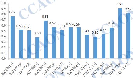 据最新海关统计数据,2023年3月当月,我国氯乙酸出口量为0.82万吨,环比上月下降9.25%,同比去年增长62.48%;2023年一季度我国氯乙酸累计出口2.29万吨,同比增长27.51%。数据显示,3月份我国氯乙酸外贸出口尚可,但国内下游企业采购乏力,市场供大于求的情况仍未取得根本改善。就企业后续接单情况来看,4月份我国氯乙酸出口多将延续较好情况。