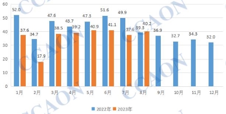 根据最新的海关统计数据,2023年8月份我国PVC地板出口量为40.2万吨,环比上月增加6.9%,同比去年上涨2.4%。2023年1-8月份我国PVC地板累计出口293.1万吨,与去年同期366.1万吨相比,减少19.9%。据了解,国外需求持续低迷,PVC地板企业出货不畅,在库存压力不断提升的情况下,厂家整体开工负荷略有降低。8月份出口量虽有所增加,但好转程度有限,据生产企业和贸易商反映,9月份外盘询单仍显不足,部分终端客户要求订单延期,由此预计短期内国内PVC地板出口数量难有明显突破。