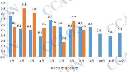 最新海关统计数据显示,2023年8月我国氯乙酸出口量为0.5万吨,环比上月下降24.3%,同比去年减少10.1%。2023年1-8月份,我国氯乙酸累计出口4.9万吨,同比增长8.1%。据了解,8月国内氯乙酸市场受原料冰醋酸行情持续走高的支撑,交投重心出现上调,出口接单情况欠佳,环比同比均出现一定下降,考虑到9月份氯乙酸行情延续上行走势,后续出口量或将继续小幅减少。