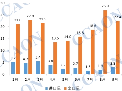 分析来看,9月份PVC外贸签单有所放缓,出口量环比出现一定下降,但相比往年,月度出口量仍处于较高水平。一方面国内需求不足,导致行情重心持续下行,生产企业和贸易商积极寻求扩大出口;另一方面,7月开始,海外客户陆续补仓,但除中国外的其他出口地区的PVC装置检修较为集中,我国PVC纯粉出口机会较好。10月中旬国际PVC报盘价格下跌,中国PVC纯粉出口压力增大,预计月度出口数据将小幅回落。