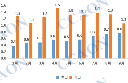 具体分析,进口方面,9月份国内糊树脂行情延续上行走势,与进口货源价差逐渐缩小,10月份国内糊树脂生产企业仅有个别装置检修,供应充裕。出口方面,受俄罗斯等国家天气转冷,下游企业开工受阻,国内糊树脂出口量或将有所下调。