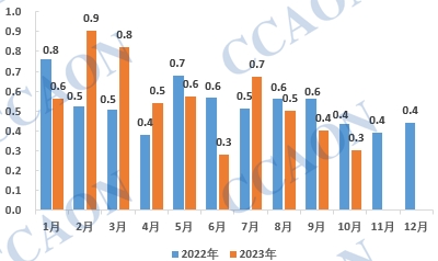 根据最新海关统计数据显示,2023年10月当月我国氯乙酸出口量为0.3万吨,环比上月下降16.0%,同比去年减少21.9%。2023年1-10月我国氯乙酸累计出口5.6万吨,同比增长1.8%。