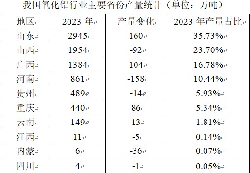 2023年,我国氧化铝行业产量分布格局基本稳定,三大产区位于以山东、山西和河南为主的北方产区和广西为主的华南产区,以及贵州、重庆、云南和四川为主的西南产区,此外内蒙和江西地区也有个别氧化铝企业。