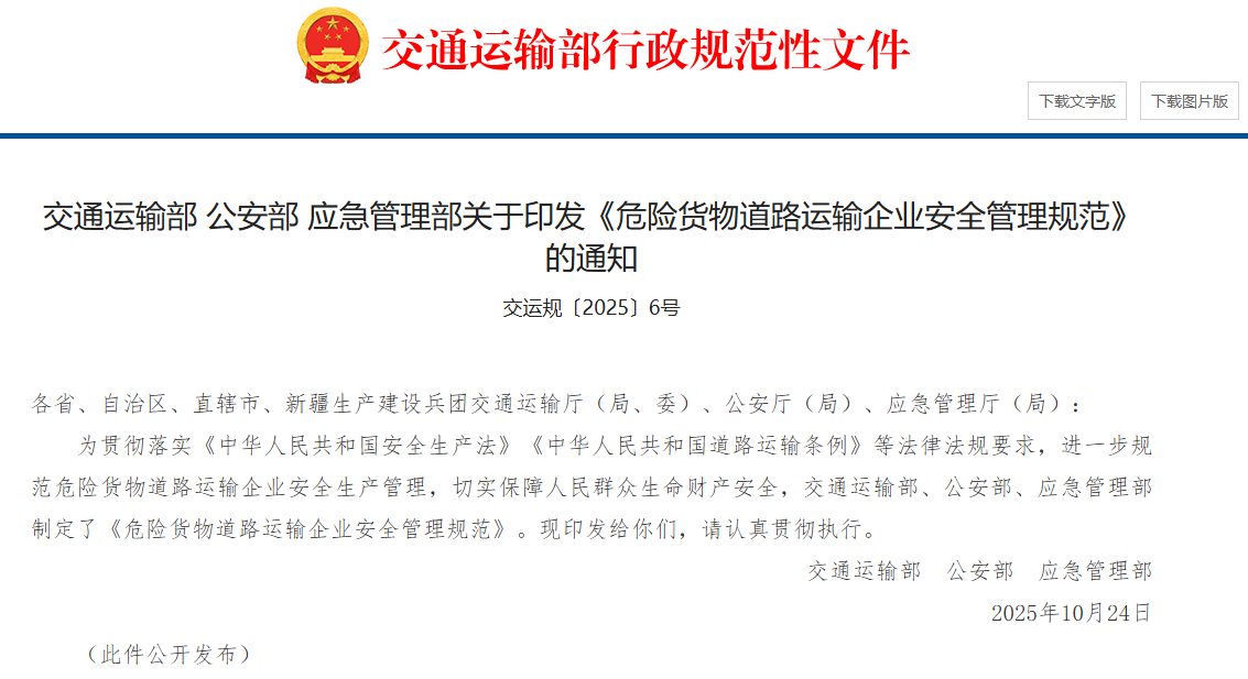 2025年10月24日,交通运输部、公安部、应急管理部关于印发《危险货物道路运输企业安全管理规范》的通知(交运规〔2025〕6号)正式发布。